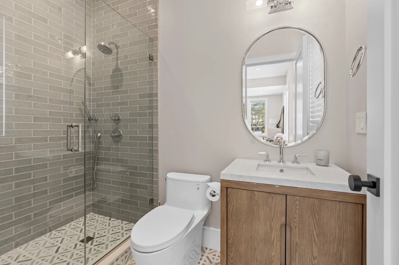 All bedrooms are en-suite, including a luxurious primary suite with a private rear-facing balcony. The spa-inspired primary bath offers radiant heated floors, a steam shower, and a soaking tub. Three balconies/roof decks enhance the second floor’s appeal. An ensuite first-floor bedroom and pre-designed optional three-stop elevator provide flexibility and long-term convenience.